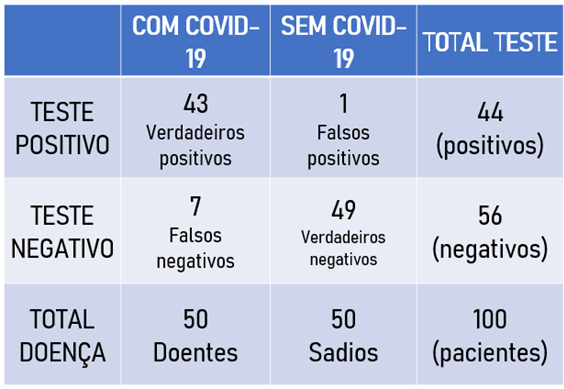 Nesse caso, tínhamos 50 pacientes com Covid-19, e 43 deram positivo; e também 50 pacientes sem Covid-19, 49 deram negativo. Logo, tivemos 7 falsos negativos e 1 falso positivo.